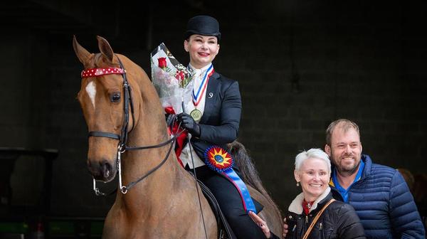 Kansas City, Mo. – With expertly executed rail and pattern work, Maggie Keith (Louisville, Ky.) secured the 2024 USEF Saddle Seat Adult Amateur Medal champion title on Friday at the UPHA American Royal National Championship Horse Show. Keith rode her longtime partner, CH CH-EQ Reedann’s Heir to Glory (Supreme Heir x Glori-Phi), a 2004 American Saddlebred gelding owned by Rozes Equine LLC, to the top of the podium.
